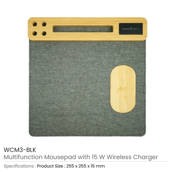 Mousepad with wireless charger made from Polyester Fabric base and features a bamboo organizer that includes a phone holder, pen holder, and a card slot. Stylish and practical, it combines productivity with tech-friendly functionality.